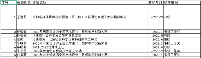 2022年以来,获得省级二等奖2人次;获得省级三等奖2人次;获得市级一等奖1人次;校级奖项3人次。此次获奖展示充分发挥了教学名师和团队的示范和引领作用,带动了全校教师投身教育教学改革创新,提高了课堂教学质量。
