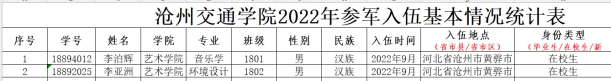 我院于2022年度在参军入伍方面,涌现出李泊辉和李亚洲两位优秀代表,他们在服役期间尽显沧交学子的上进与优异并取得了优秀成绩。