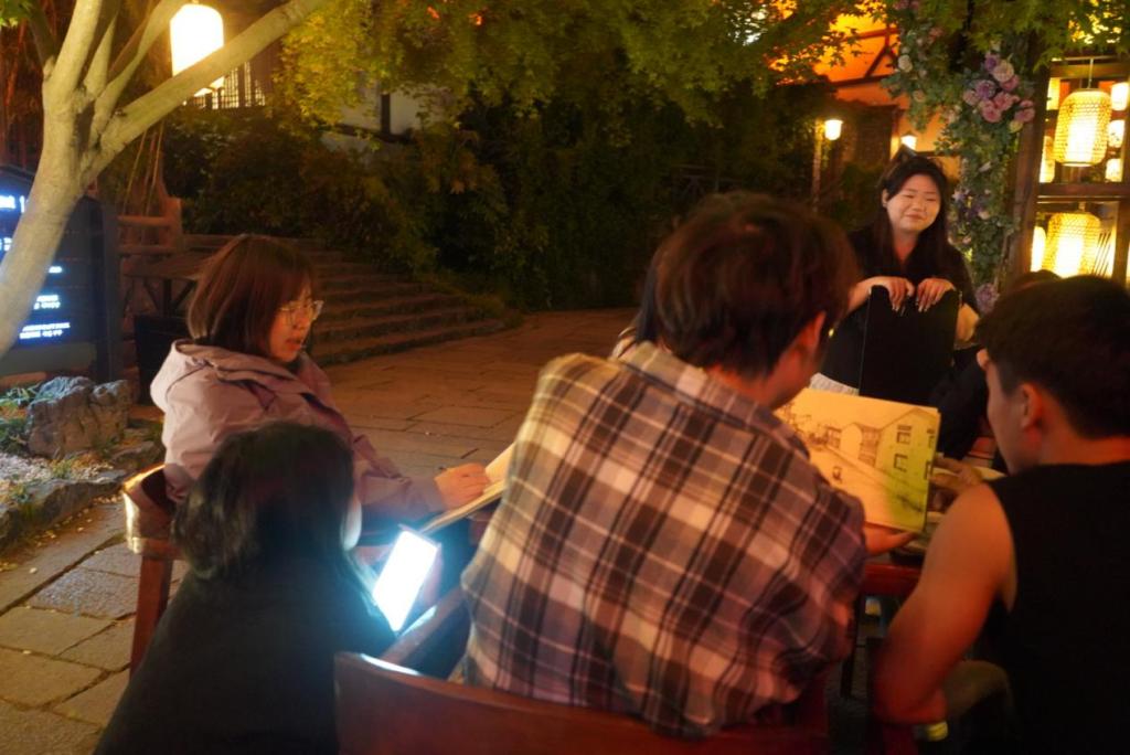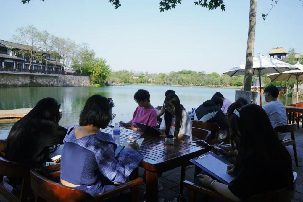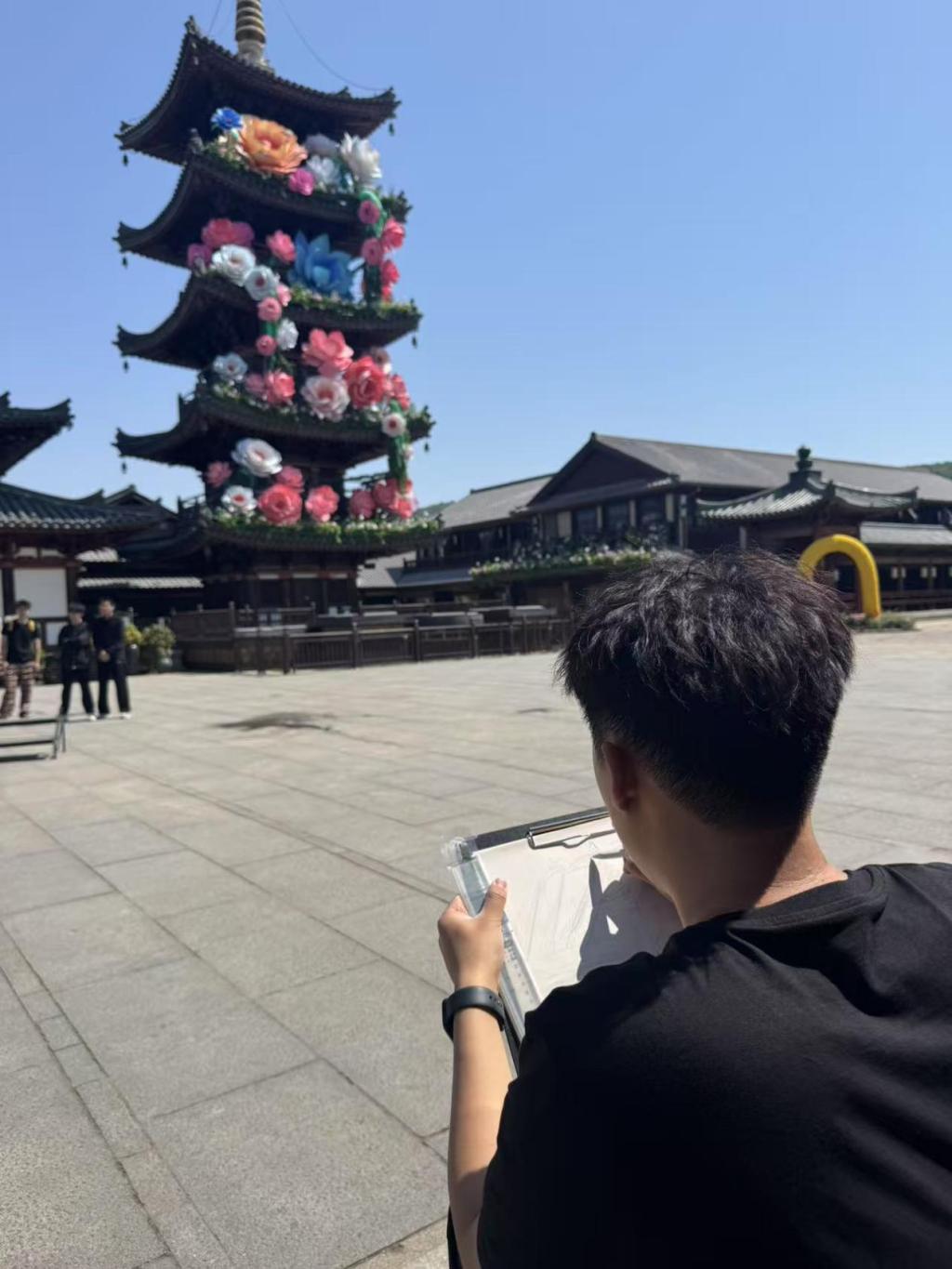 4月15日,师生来到拈花湾景区,宛如一个遗世独立的禅意小镇。唐风宋韵的建筑风格,静谧的街巷,营造出一种空灵、祥和的氛围。在这里,同学们领悟到了禅意美学的精髓,尝试将这种独特的意境融入到数字媒体艺术创作中,探索出别样的艺术表达形式,同时,拈花湾将若来动漫IP与建筑实景结合,为动漫造型设计商业化提供了良好的实践案例,为同学们动漫创作提供了优秀示范。同学们通过对建筑的绘制与勾勒,体会独特的东方禅意美学。