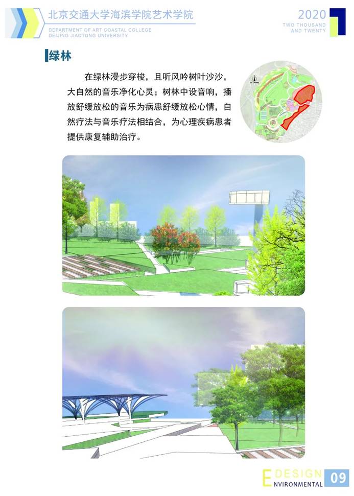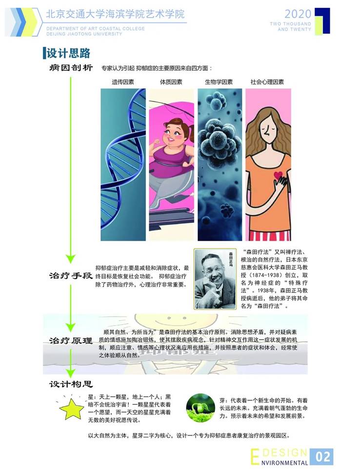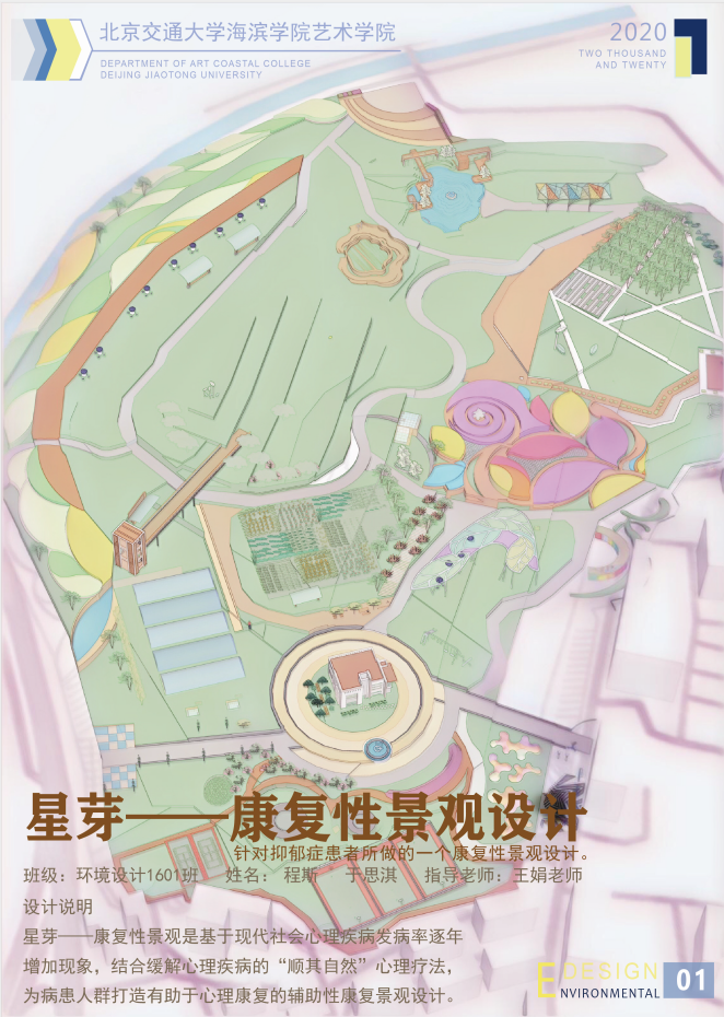 设计说明:星芽一一康复性景观是基于现代社会心理疾病发病率逐年增加现象,结合缓解心理疾病的“顺其自然”心理疗法,为病患人群打造有助于心理康复的辅助性康复景观设计。