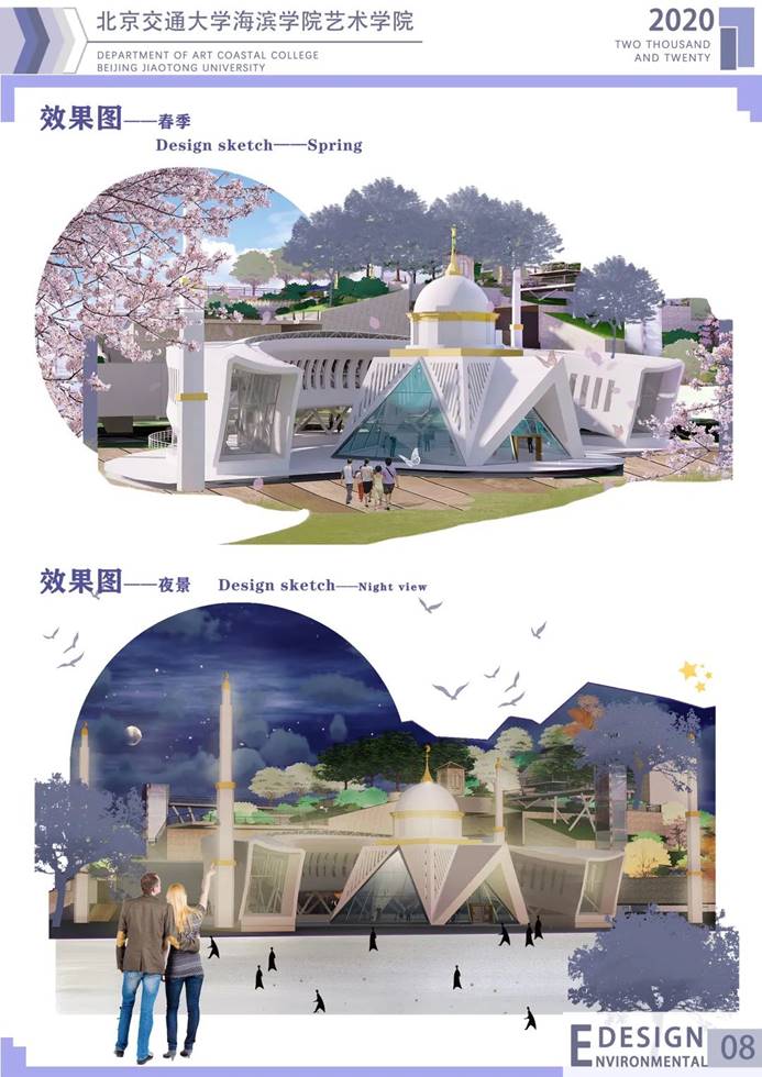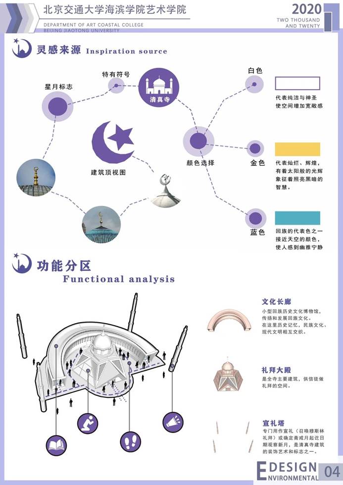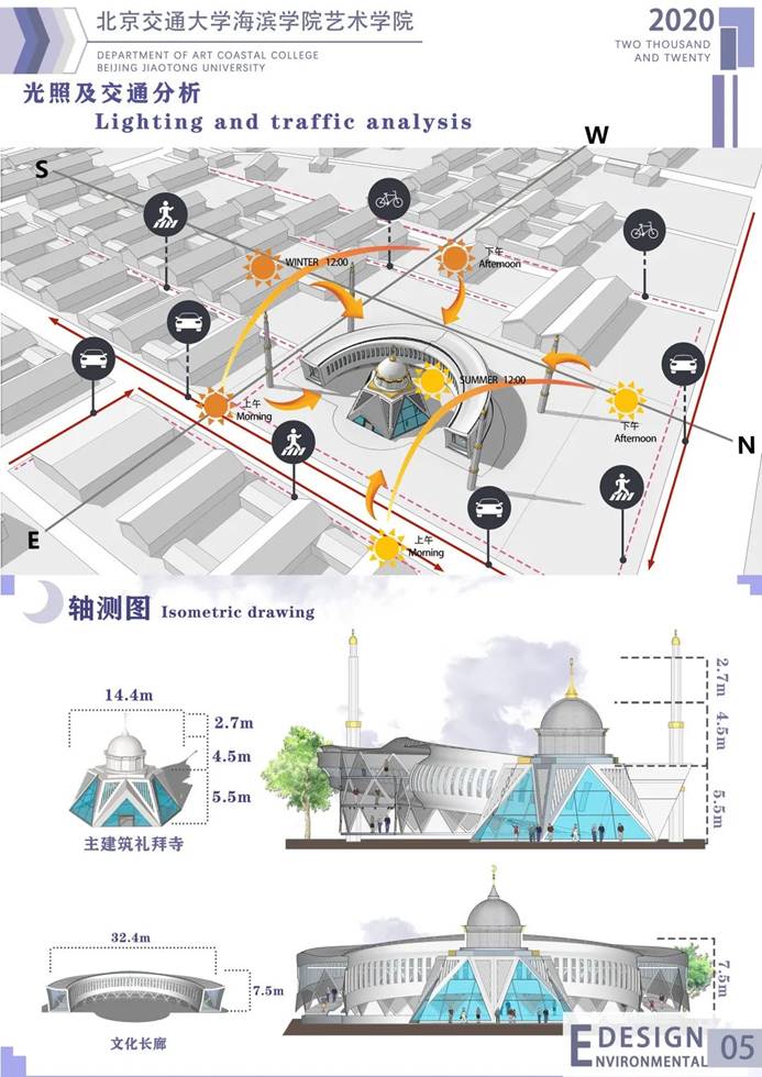 设计说明:本次设计意义是在基于保护回族特殊文化符号的前提下,对回族代表性建筑——清真寺进行概念设计,展示它丰富的宗教文化内涵和独特的艺术风格,能够为各项回族民俗文化提供便利条件,有利于更好的传承回族民族文化。