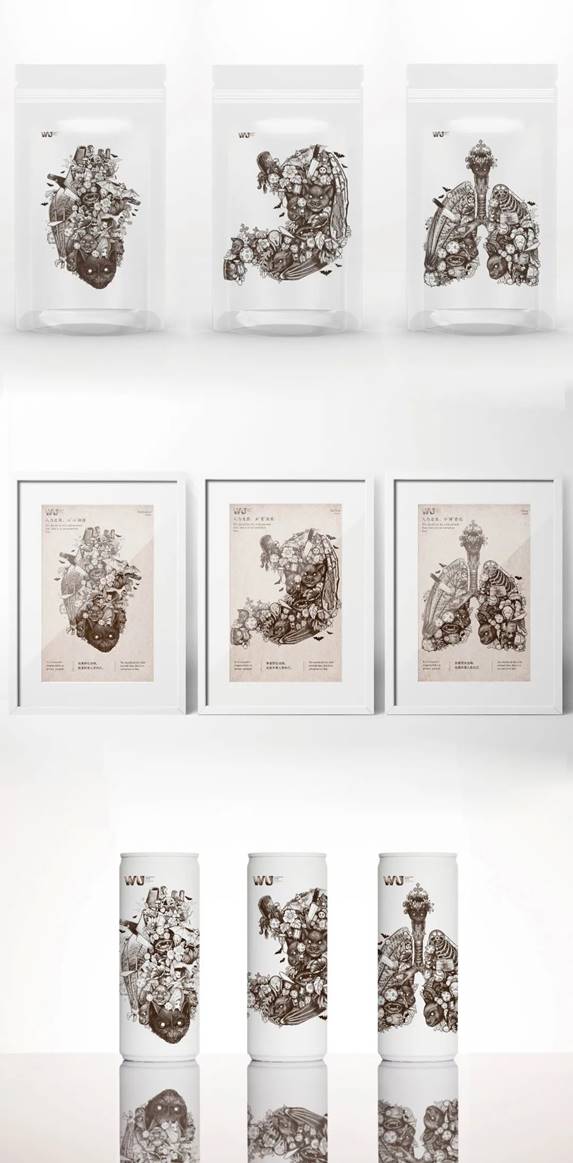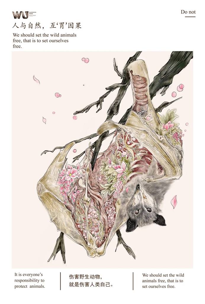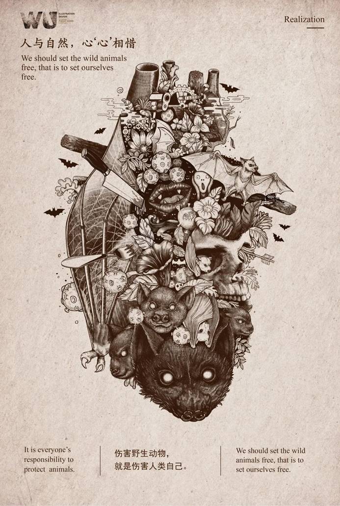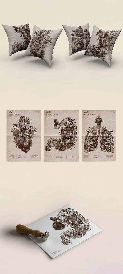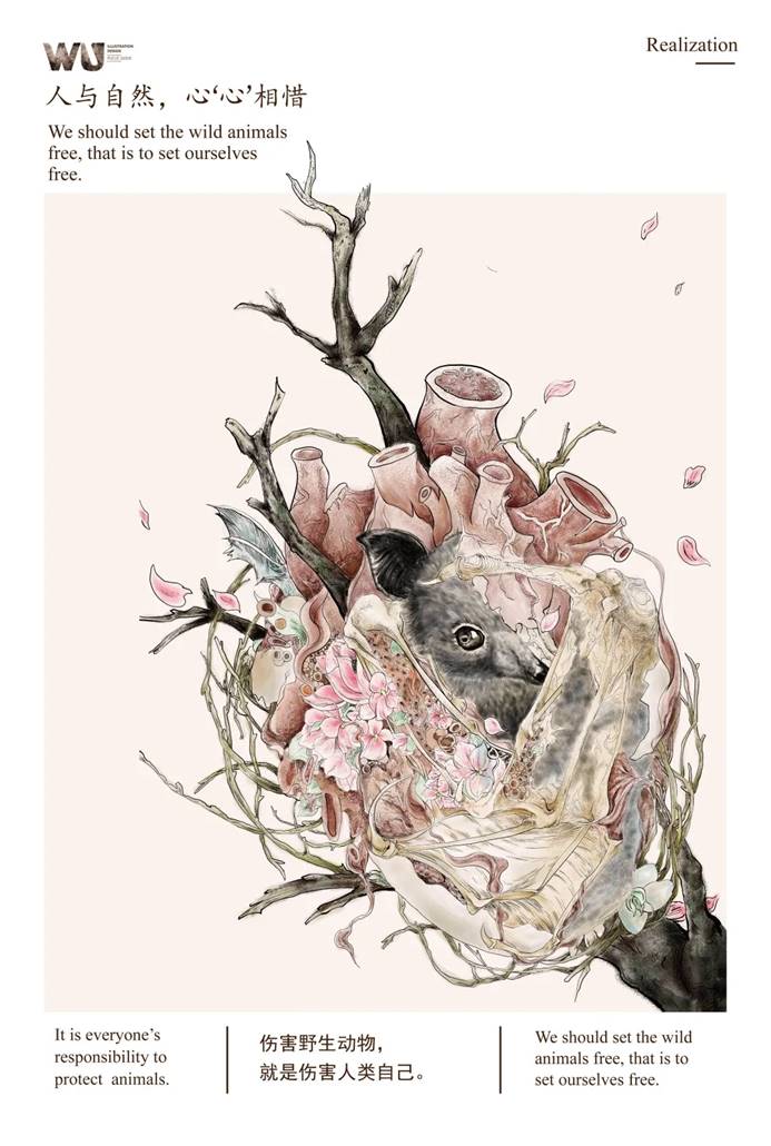 设计说明:本套毕业设计依据时事社会热点——新型冠状病毒,而做了系列环保主题插画设计“wù”,将人的器官“心”、“肺”、“胃”与动物、植物和一些场景物体等做了结合,引发观者的深思及感悟。“wù”解释为三层含义,第一层为“悟”,醒悟,悔悟,感悟,觉悟,表明人类因为伤害动物而应该引发忏悔。第二层为“物”,动物,人物,表明人与动物共生共存的内涵。第三层为“勿”,意为不要伤害动物。希望能以此呼吁人们保护身边的各类动物,忌口忌手忌伤害行为。