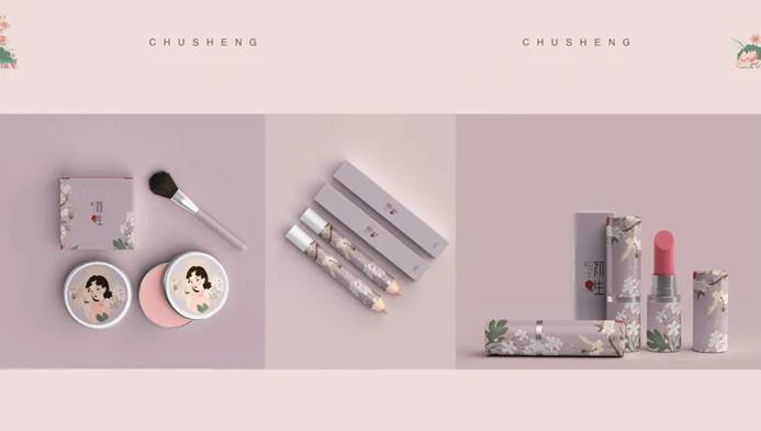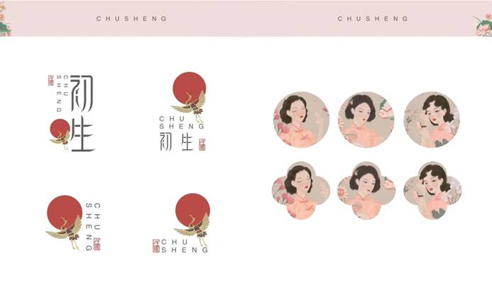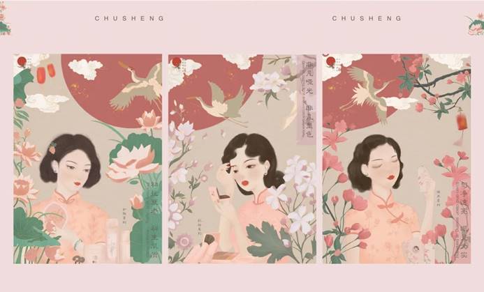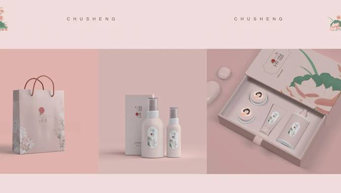 设计说明:初生护肤品牌设计从传统文化的角度出发进行品牌设计,设计主要以民国的时期女性为主体,以荷花、海棠花、桃花、仙鹤等为辅助图案进行系列设计。包装和海报统一色系,为粉色护肤系列、紫色彩妆系列和粉红色保养系列。