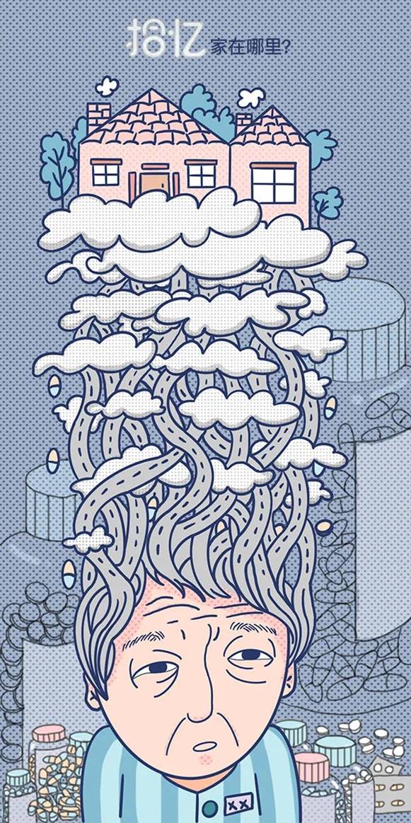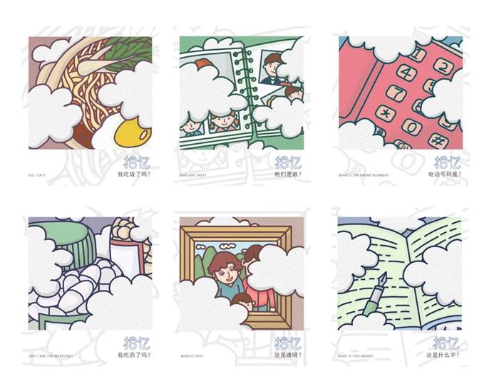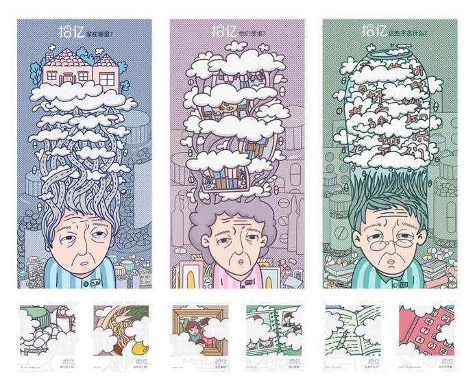 设计说明:毕业设计题目为“《拾忆》主题设计”,以失忆老人为主题,根据老人病症将其分为生活类,情感类,知识类,通过插画的形式进行系列招贴设计、病症卡片设计以及APP界面延展设计等,通过视觉平面宣传的形式,呼吁人们对此病症老人更多的关心,理解。