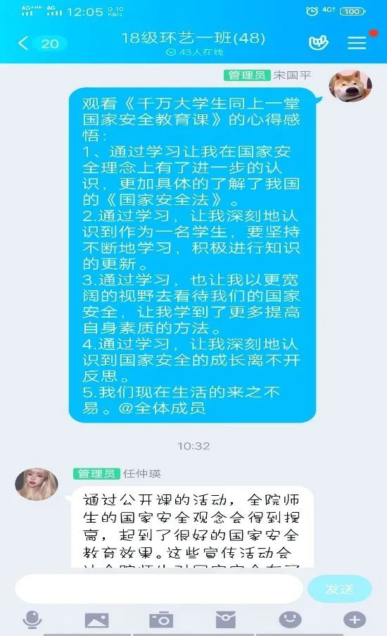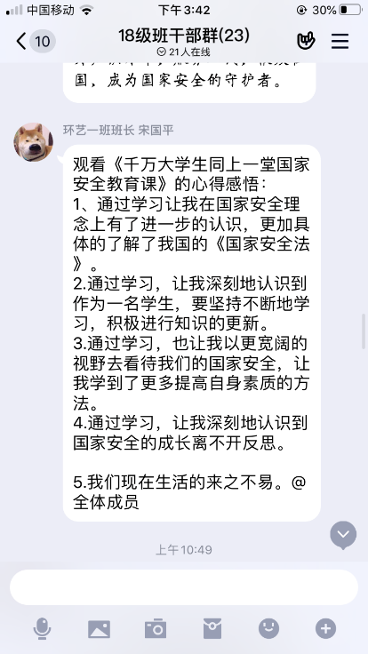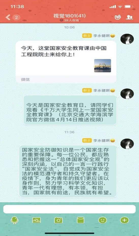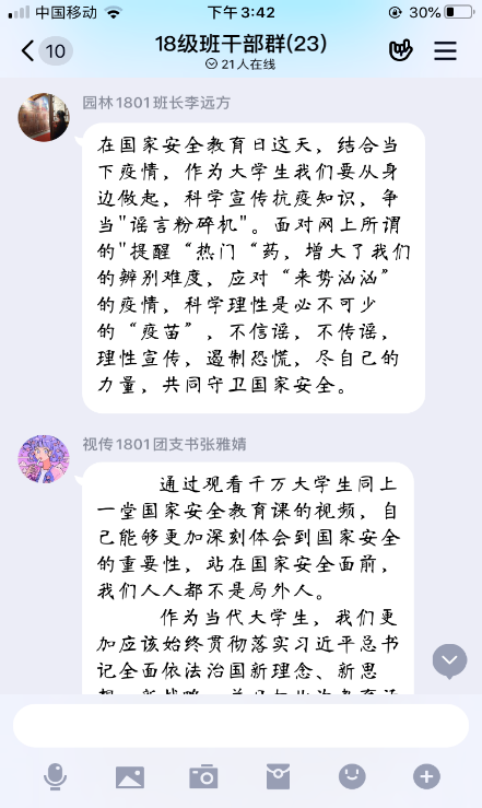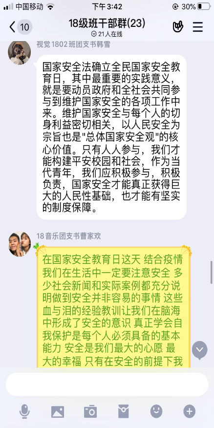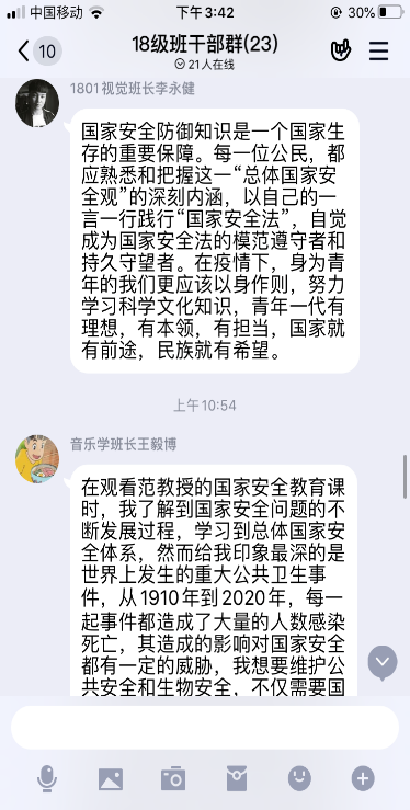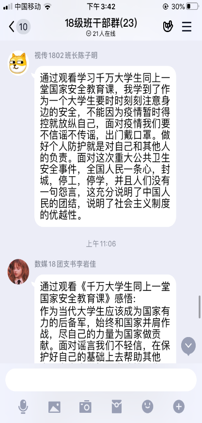 通过观看学习《千万大学生同上一堂国家安全教育课》课程,同学们详细了解到国家安全的内容以及维护国家安全的正确做法。活动极大地增强了同学们的国家安全意识,让同学们牢记国家安全无小事,它与每个人的生活密切相关。另外,我院各班级群以及班级干部群同时开展线上沟通交流了在这次公益课中的收获并进行了深刻的思考感悟。