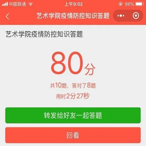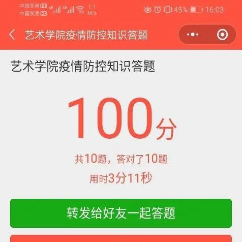 我院通过微信平台进行了师生线上疫情防控知识“打榜”活动,以答题的形式更好的促进师生熟悉和巩固疫情防控的相关知识,做好自我防控和学生管理。